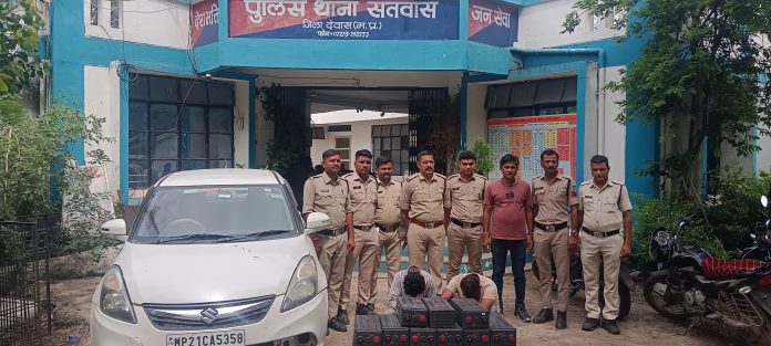 तत्काल मय फोर्स के मुखबिर द्वारा बताये स्थान खातेगांव सतवास मार्ग ग्राम पीपल कोटा राधा स्वामी सत्संग ब्यास के सामने पहुंचे जहां पुलिस टीम द्वारा घेराबंदी कर आरोपी अफजल पिता हन्नु खान निवासी कुल हरदा एवं सुखराम पिता सदाराम निवासी मांदला के कब्जे से कुल 24 बैटरी कीमती 20,0000/- रुपये एवं 01 मारुति सुजुकी स्विफ्ट कार कींमती 40,0000/- रुपये कुल 60,0000/- का मश्रुका जप्त कर आरोपी के विरूद्ध थाना सतवास में अपराध क्रमांक 255/25 धारा 331(4)305A बी एन एस का अपराध पंजीबद्ध कर विवेचना में लिया जाकर आरोपी को माननीय न्यायालय के समक्ष पेश किया गया ।