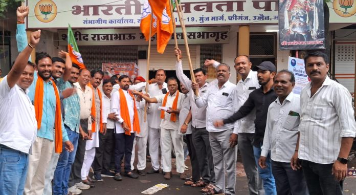 उज्जैन। भारतीय जनता पार्टी जिला उज्जैन ग्रामीण द्वारा आज भाजपा के संगठन पर्व के अंतर्गत प्रदेश अध्यक्ष श्री हेमन्त खण्डेलवाल के निर्वाचित होने पर भाजपा जिला कार्यालय लोकशक्ति पर पदाधिकारी एवं कार्यकर्ताओं ने हर्षाेल्लास के साथ आतिशबाजी कर व मिठाई वितरित कर, भारतीय जनता पार्टी जिंदाबाद के नारे लगाकर उत्सव मनाया। जिला मीडिया प्रभारी श्री गजेन्द्र परमार ने जानकारी देते हुए बताया कि जिलाध्यक्ष श्री राजेश धाकड़ जी के निर्देशानुसार प्रदेश अध्यक्ष की औपचारिक घोषणा के बाद जिले के समस्त मण्डलों में मण्डल कार्यालय पर व जिला मुख्यालय पर आतिशबाजी कर उत्साह मनाया गया। इस अवसर पर मुख्य रूप से जिला कार्यालय मंत्री श्री सुमेरसिंह कालुहेड़ा, मण्डल अध्यक्ष श्री अजय जोशी, श्री विक्रमसिंह गनावा एवं श्री रमेशचन्द्र चौधरी, श्री देवीलाल पाटीदार, श्री सेवाराम बेगाना सहित अनेक कार्यकर्ता उपस्थित रहे।