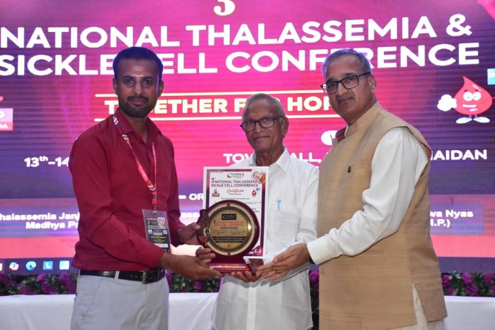 भविष्य दर्पण दुर्गाशंकर टेलर आगर मालवा= थैलेसीमिया एवं सिकल सेल से जुड़े विषयों पर नीमच में आयोजित दो दिवसीय राष्ट्रीय कार्यशाला में आगर के रक्तमित्र बैजनाथ ब्लड डोनेशन ग्रुप के शिवनारायण बगड़ावत को विशेष सम्मान प्रदान किया गया। बगड़ावत को थैलेसीमिया से पीड़ित बच्चों की मदद एवं निरंतर सामाजिक योगदान के लिए सराहते हुए मंच पर सम्मानित किया गया।