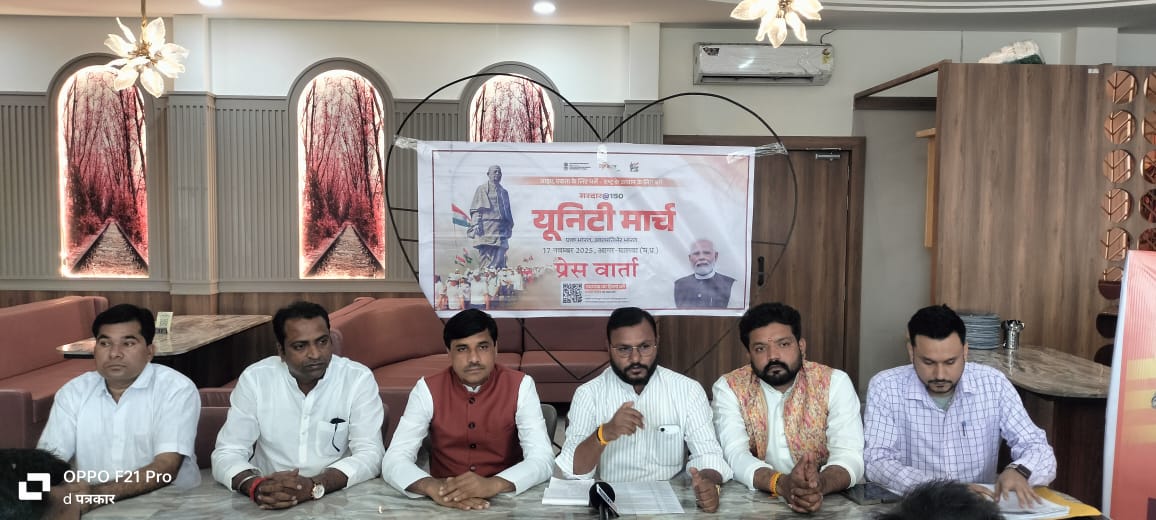 भविष्य दर्पण दुर्गाशंकर टेलर आगर की मोन्टू होटल में शनिवार को भाजपा ने ‘एक भारत, आत्मनिर्भर भारत’ विषयक यूनिटी मार्च को लेकर प्रेसवार्ता की। दोपहर 12 बजे आयोजित इस कार्यक्रम में भाजपा जिलाध्यक्ष ओम मालवीय ने देश के पहले उप प्रधानमंत्री और स्वतंत्रता सेनानी सरदार वल्लभभाई पटेल की 150 वीं जयंती पर उनकी याद में 17 नवंबर को आगर में सांसद महेन्द्र सिंह सौंलकी के नेतृत्व में निकाली जाने वाली पदयात्रा का ऐलान किया। मालवीय ने बताया कि, “सरदार पटेल ने आज़ादी के समय 562 रियासतों को एक सूत्र में पिरोकर, जातिवाद, भाषा वाद, क्षेत्रवाद और संप्रदायवाद जैसी विभाजनकारी ताकतों को परास्त किया। उन्होंने ‘एक भारत, श्रेष्ठ भारत’ का संदेश दिया। उनकी स्मृति में इस पदयात्रा के माध्यम से हम भी यही संदेश आम जनता तक पहुंचाएंगे। यह कदम हमें एकजुटता और राष्ट्रभक्ति की ओर प्रेरित करेगा।”जिला पंचायत कार्यालय से प्रारंभ होकर नगर के प्रमुख मार्गों से होती हुई पुरानी कृषि मंडी में समापन होगा।